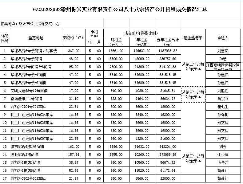 2020年11月25日上午10時,在贛州市公共資源交易中心舉行的贛州振興實業有限責任公司八十八宗資產公開招租(項目編號:GZCQ202092),現將公開招租成交情況公示如下: